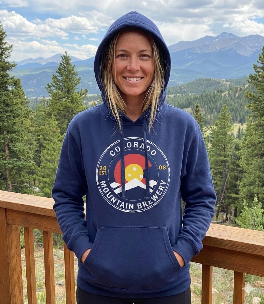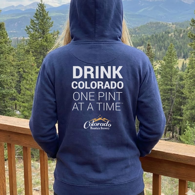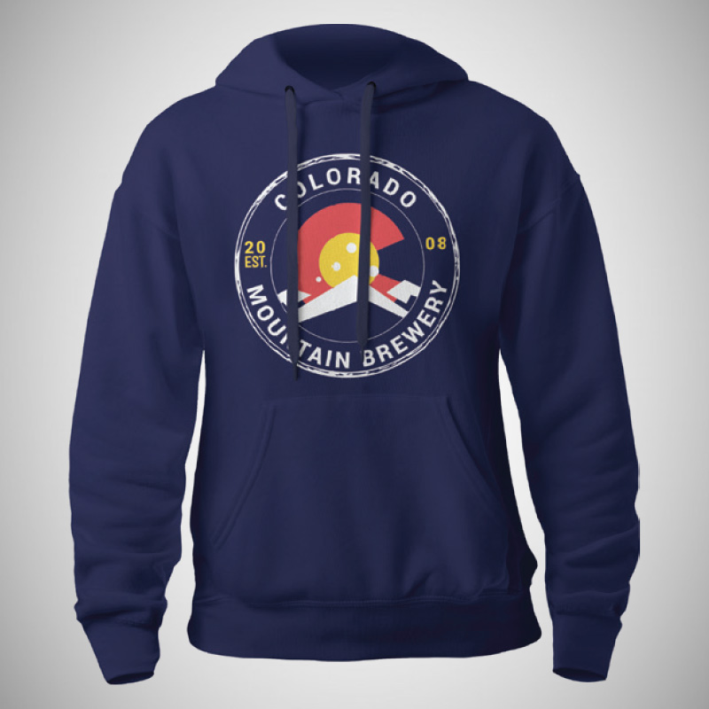 A comfortable, navy blue pullover hoodie featuring the official Colorado Mountain Brewery logo. Includes the iconic red ‘C’ from the Colorado flag over snowy mountain peaks. Established 2008. Back of shirt says “Drink Colorado one pint at a Time”